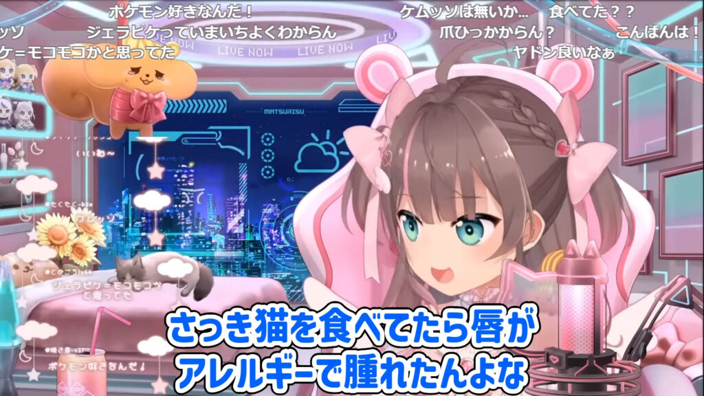 配信中、飼い猫にキスをするようなスキンシップをとったところ、アレルギー反応で唇が腫れてしまったと報告しました。過去の配信で公開したアレルギー検査の結果をあらためて振り返り、複数の項目で高い数値が出ていることを明かしています。