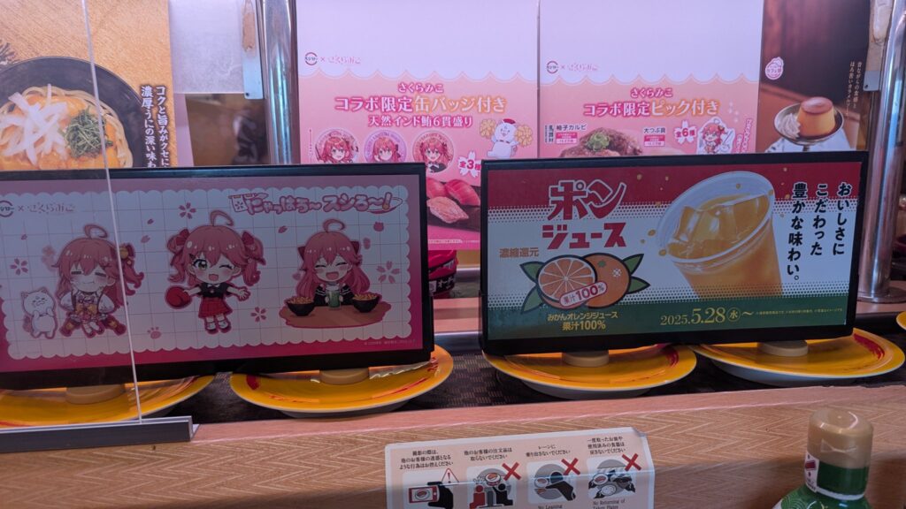 店内に入ると、店内に入ると、さくらみこの世界観がさらに展開されています。回転レーンの仕切りやタッチパネルが「さくらみこ仕様」に。特にタッチパネルでは、対象メニューの横にデフォルメされたみこちが表示され、注文画面を開くだけで笑顔になれる仕様となっています。
