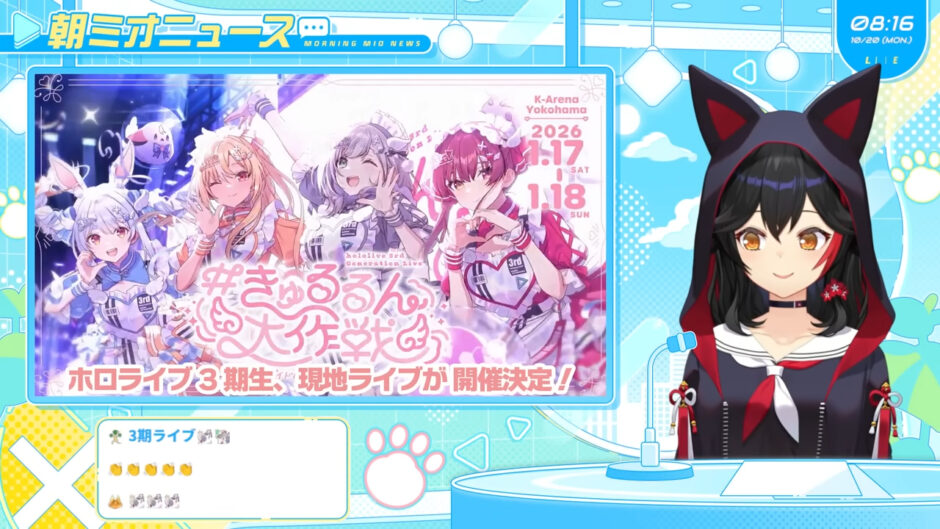 ホロライブゲーマーズ所属の大神ミオさんが自身の配信にて、2026年1月開催予定の「ホロライブ3期生ライブ」のチケット販売方法について言及。