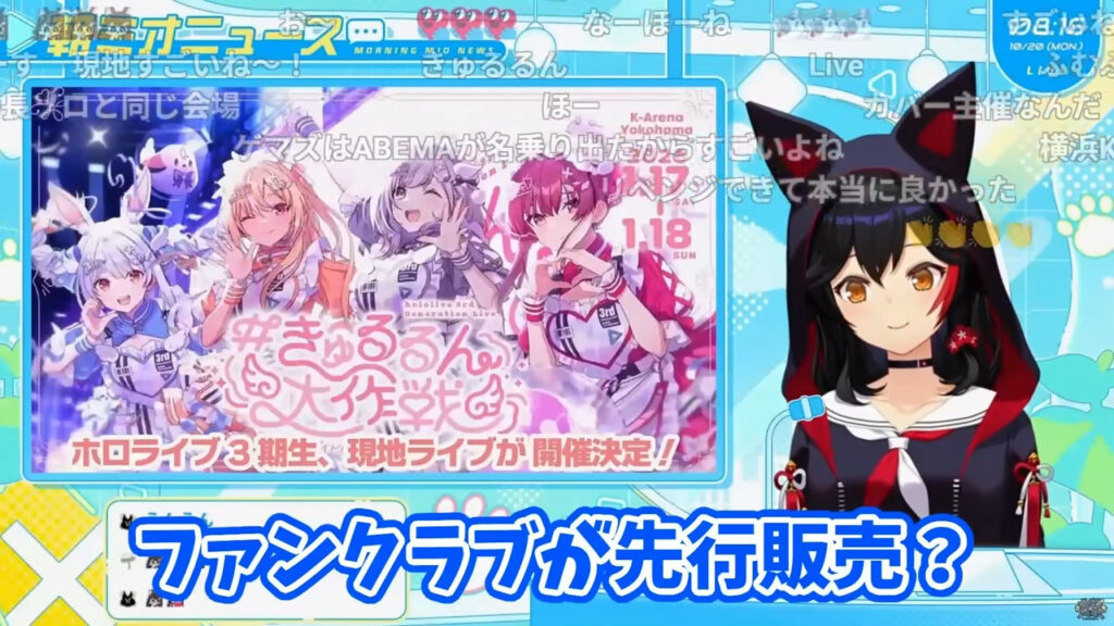 ミオさんは配信中、今回の3期生ライブのチケット販売について「ファンクラブが先行で、第1次先行がファンクラブ、2次先行から(一般も)普通に変えますみたいな形になるんだと思います」と、ファンクラブ会員が最速で申し込み可能になるという見通しを語りました。