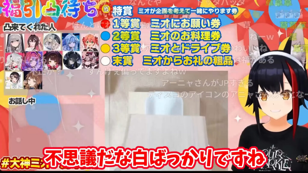 今回の配信は、大神ミオさんがホロライブメンバーを対象に行った福引企画でのことです。配信序盤、特賞(金)を獅白ぼたんさんが引き当てた後、他のメンバーが引くのは「ハズレ(白)」ばかりという状況が続きました。大神ミオさん自身も「不思議だな、白ばっかりですね」と首をかしげる中、登場したのが兎田ぺこらさんです。