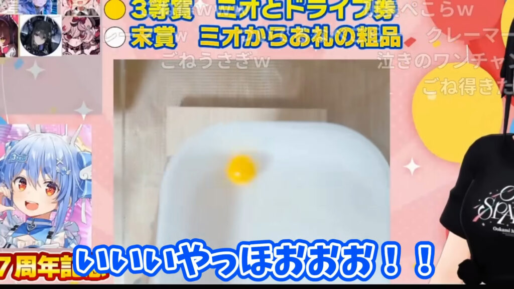 結果は無情にも「白(ハズレ)」。これには兎田ぺこらさんも「入ってない!全部開示して!」「開示だ!」と猛抗議しました。しかし、あまりに当たりが出ない状況を見かねた大神ミオさんが「ワンチャンね、もう一回回してみる?」と救済措置を提案。この温情による二度目の挑戦で、見事「黄色(3等)」を引き当てました。
