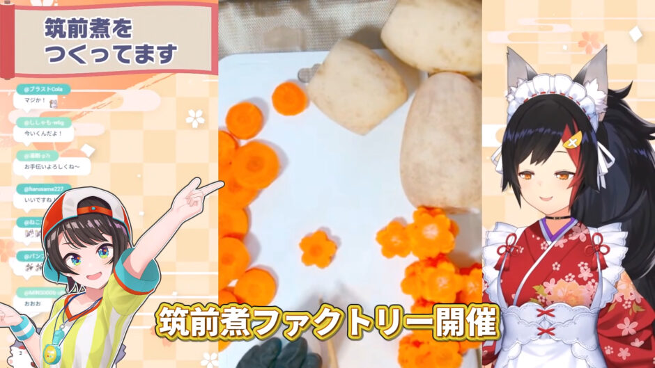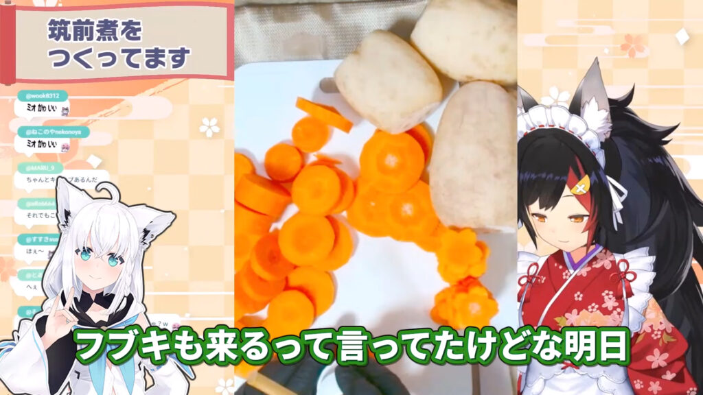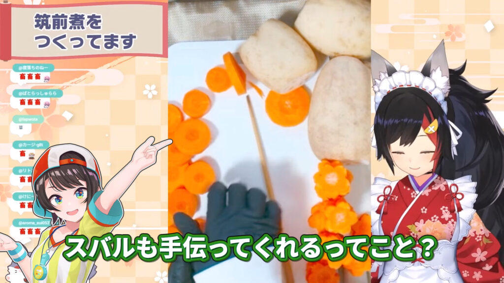 ミオさんもこの話に賛同し、「ニンジンの型抜き抜くくらいなら全然できるもんね」と、来年の筑前煮作りへの戦力として期待を寄せました。スバルさんが料理の腕を上げれば、来年の年末には本当に「筑前煮ファクトリー」が稼働し、より多くのメンバーに美味しい料理が振る舞われることになるかもしれません。