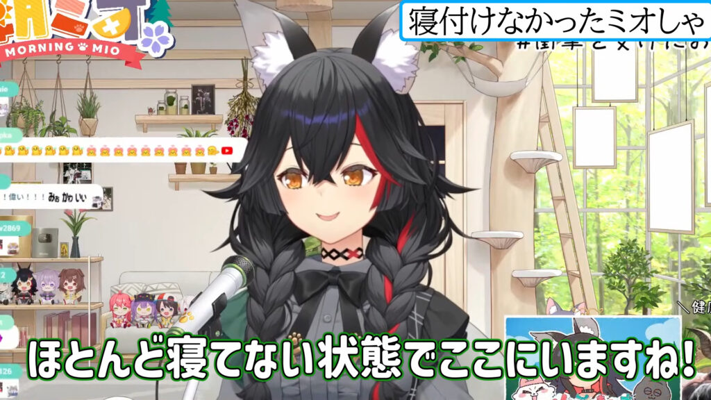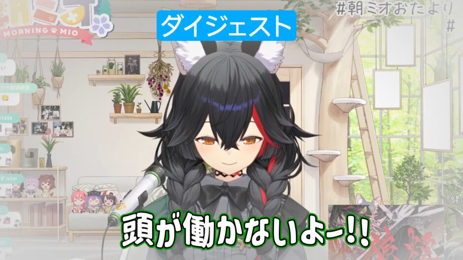 ほぼ徹夜の状態で朝配信に臨んだミオさん。配信冒頭から「寝てない」「終わった」「頭が働かないよ」とぼやきが止まりません。