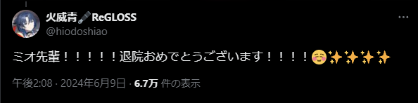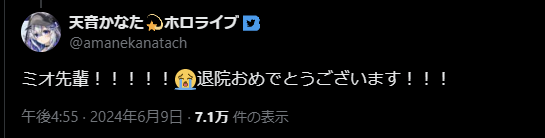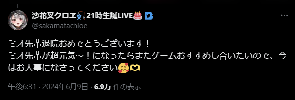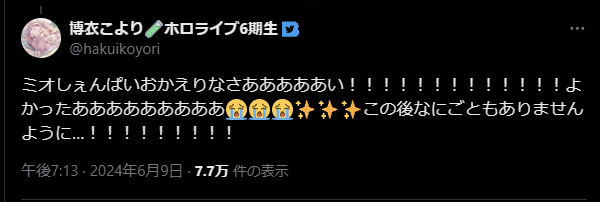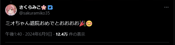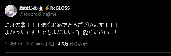ホロライブゲーマーズの一人である、大神ミオが退院を報告し、ファンやホロライブメンバー(ホロメン)の間で快気祝いの言葉で溢れていた。