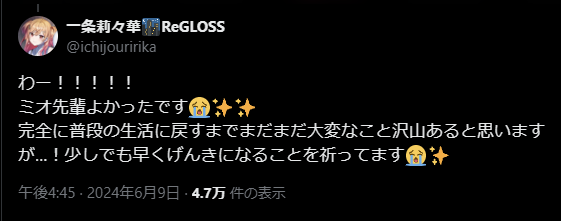 ファンの応援とともに、大神ミオの早期回復を祈る声が広がっている。