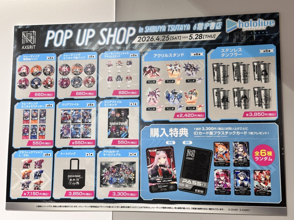 2026年4月25日(土)から5月28日(木)まで、SHIBUYA TSUTAYA 6階 IP書店にて、AXGRIT第5弾企画「ホロライブEnglish -Myth-&-Promise-」POP UP SHOPが開催されています。