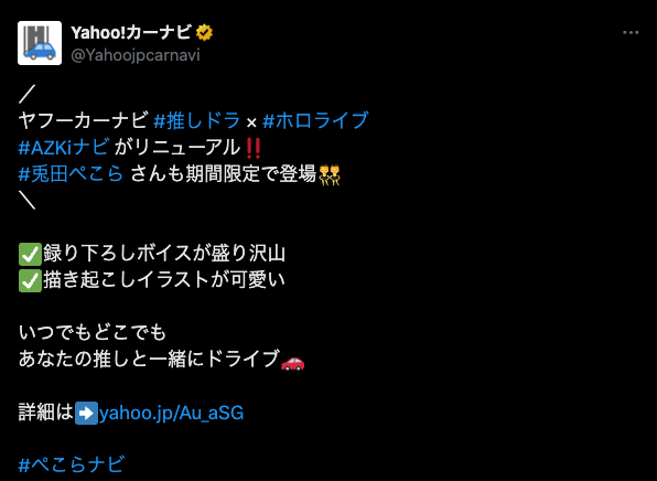 今回のコラボは、Yahoo!カーナビの人気機能「推しと一緒にドライブ(推しドラ)」の一環として行われるものです。