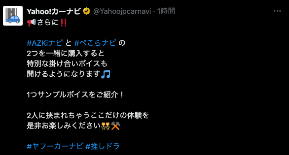 Yahoo!カーナビの公式X(旧Twitter)は、「2人に挟まれちゃうここだけの体験を是非お楽しみください」という魅力的なコメントと共にサンプルボイスを投稿。
