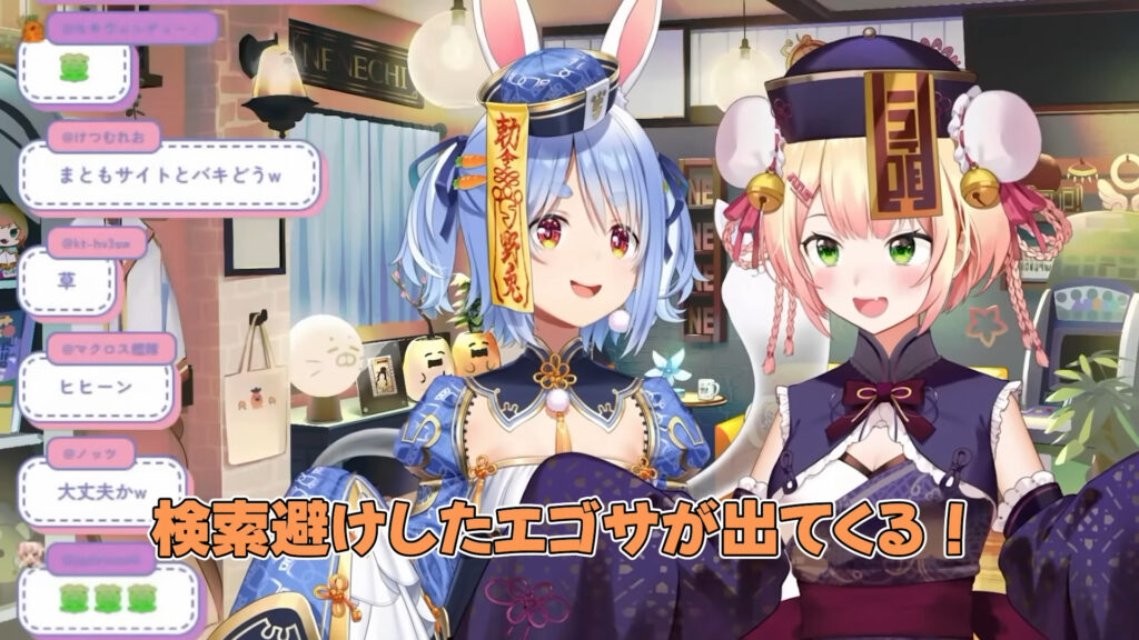 ねねさんによると、「ねね」という名前だけでなく、「MMSZ」(桃鈴の頭文字)というアルファベット表記でも検索をかけているという。「検索避けされてるエゴサの内容が出てくるんよ」と説明するねねさん。これを聞いたぺこらさんは「じゃあペコラだったらUSD?」と自分に置き換えて確認。ねねさんが肯定すると、「これやると検索避けされてるやつが出てくるの?」と驚きを隠せない様子だった。