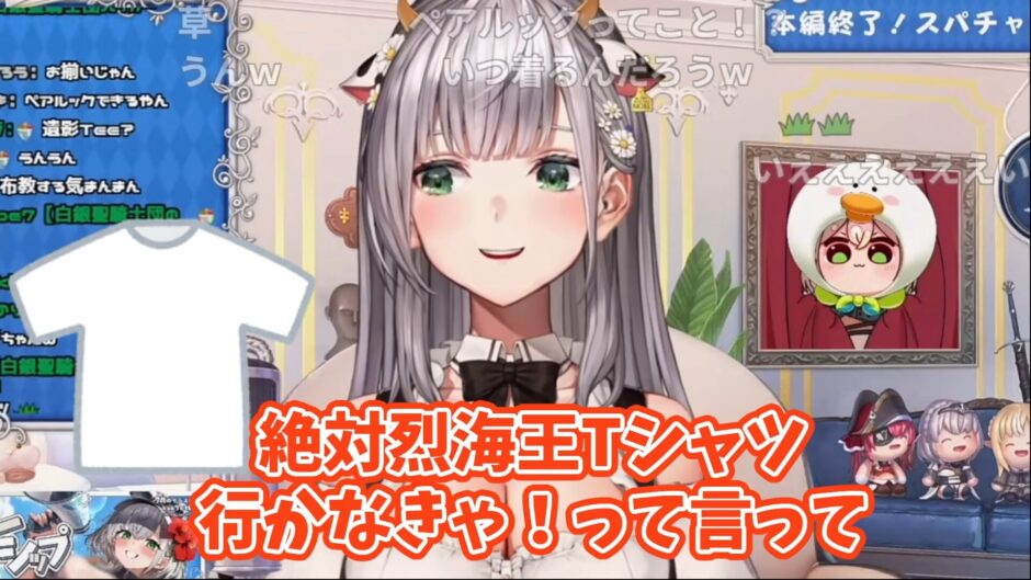 しかし、パーティー会場に到着した白銀さんを待っていたのは、誰も例のTシャツを着ていないという悲しい現実。約束をしたはずの大空さん本人すら着ておらず、白銀さんは気まずさから直接言い出せなかったことを告白。そこで白銀さんは大空さんが席を外した隙に、その場にいた白上フブキさんに