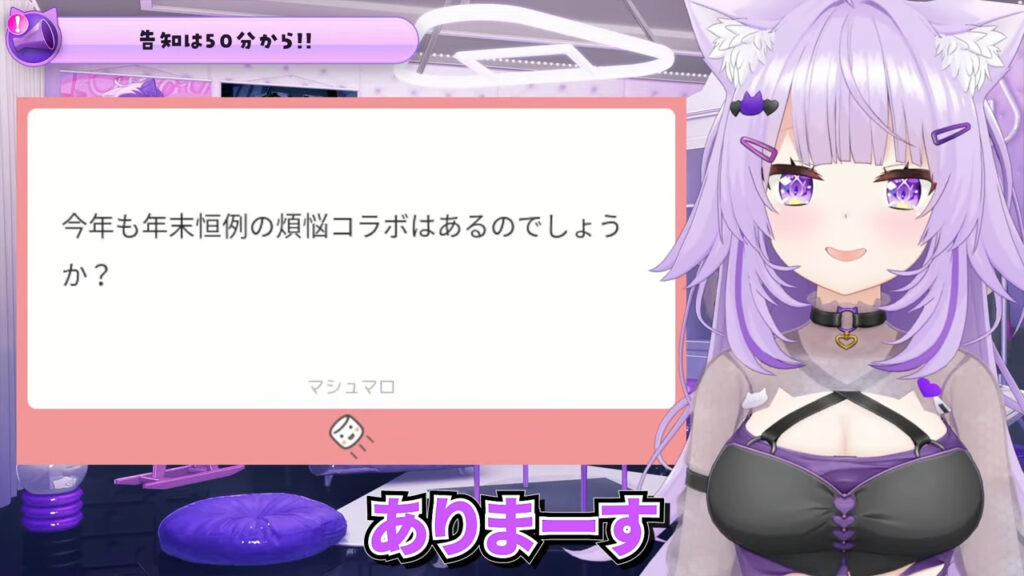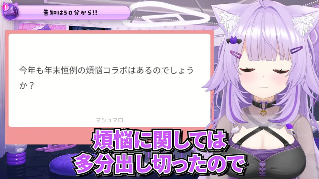 配信中、リスナーから「今年も年末恒例の煩悩コラボはあるのでしょうか?」という質問が寄せられると、猫又おかゆさんは次のように答えました。