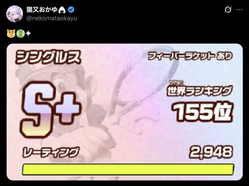 ホロライブ所属VTuber・猫又おかゆが、Nintendo Switch 2用ソフト『マリオテニス フィーバー』のランクマッチにおいてシングルスでランクS+に到達したことを報告し、話題を集めている。