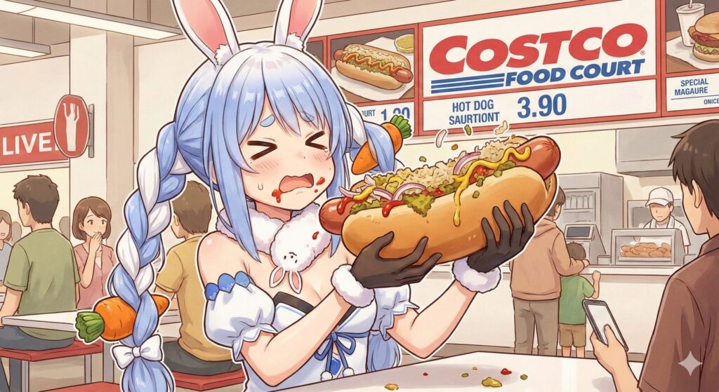 買い物を終えた3人は、コストコといえばおなじみのフードコートへ。そこで兎田ぺこらの「わんぱく」な一面が露呈することになりました。