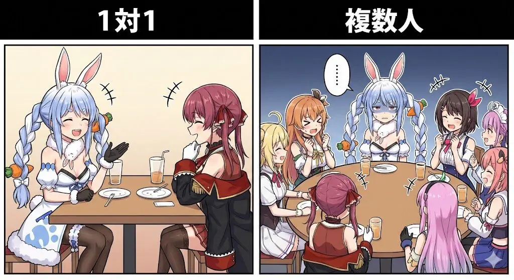 ぺこらさんは「1対1だったら話せるけど、人数が多くなるともう勘弁」と語っています。オフでの食事も「できれば1対1のほうが話せるから」と、少人数のほうがリラックスできるタイプであることを明かしました。
