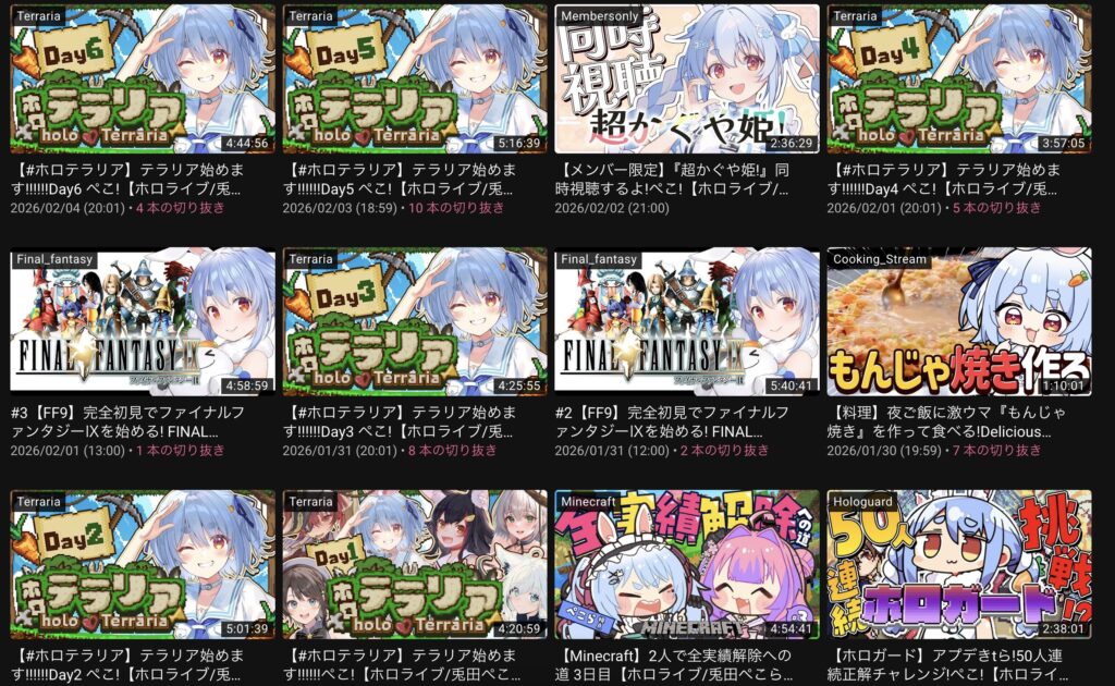 たとえば12月26日は、12月27日午前4時39分に終了した8時間超の配信によって26日夜から27日明け方までをカバー。1月11日も、1月12日午前1時7分終了の枠によって11日深夜の活動が確保されています。