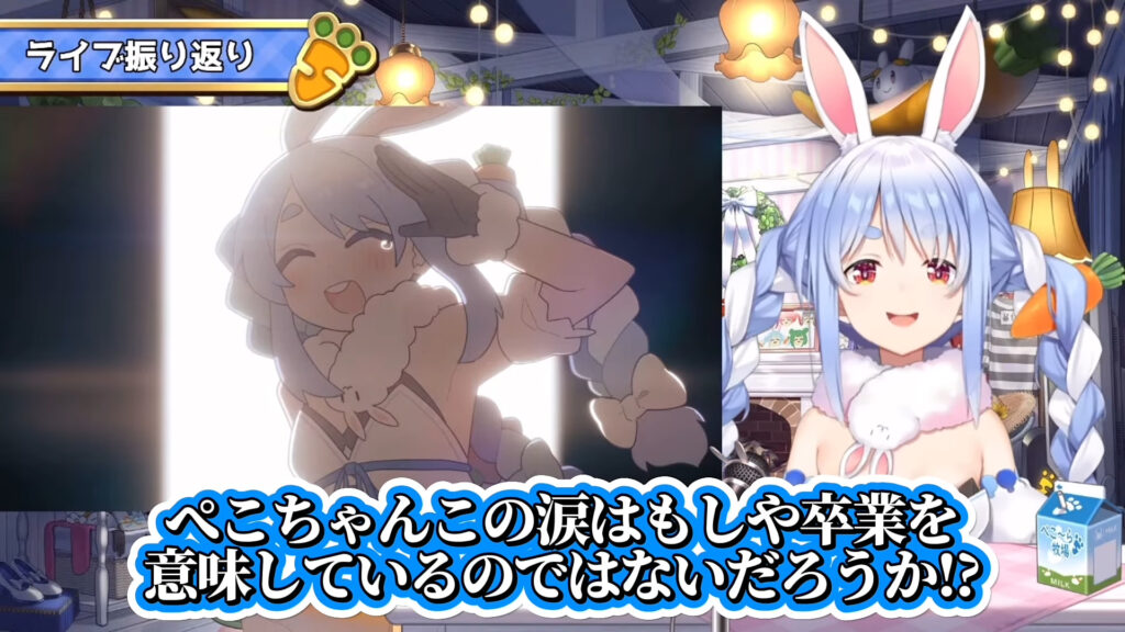 こうした一部のファンの心配に対し、ぺこらさんは配信で問題のシーンを映し出すと、開口一番「『この涙は卒業を意味してるんちゃう?』…するわけねえだろ!」と一刀両断。