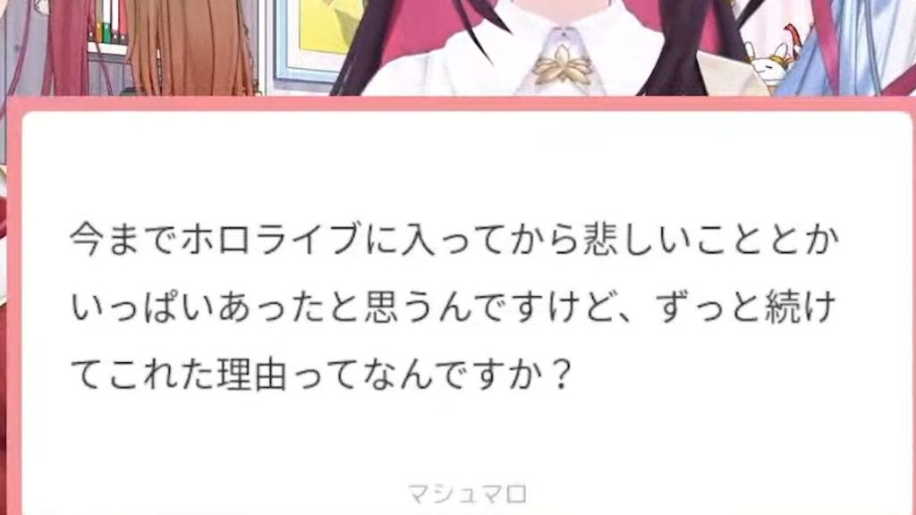 視聴者から寄せられた「ホロライブに入ってから悲しいことがあっても活動を続けてこれた理由は?」という真摯な質問をきっかけに、3人がそれぞれの胸の内を語り始めました。
