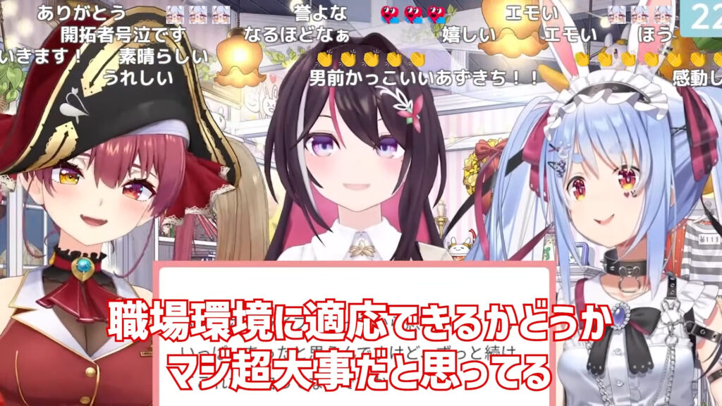 と持論を展開。過去にトップの方針が合わずに会社を辞めた経験を交えつつ、「この会社(ホロライブ)に適合できた、そこなんでしょうかと思います」と、独自の視点で活動継続の秘訣を分析しました。