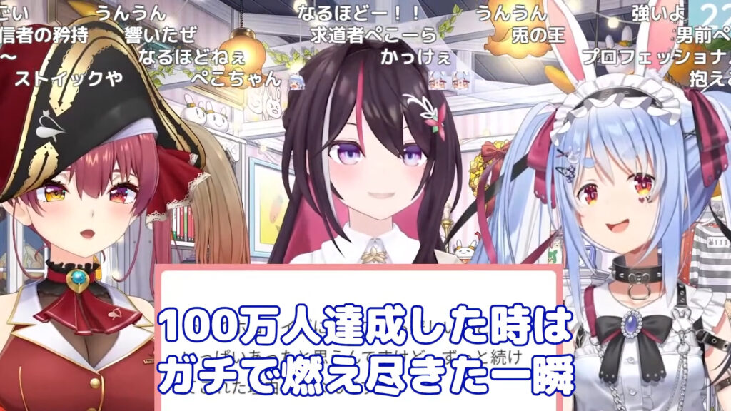 燃え尽き症候群に陥りかけたと語ったぺこらさんですが、「また新たに目標を設定して」「今もう頑張ってる」と、前を向いて活動を続けていると力強く語りました。