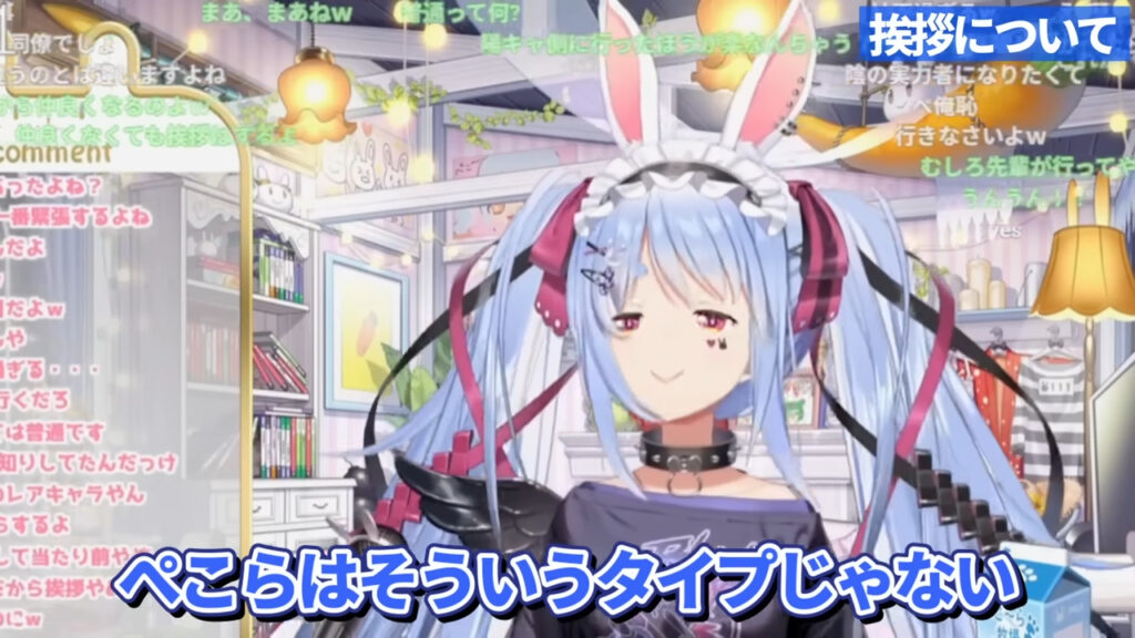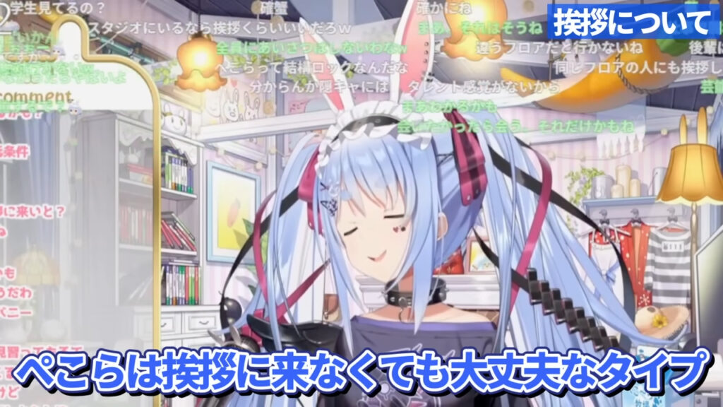 「挨拶に来なくても全然大丈夫なタイプ」と自認するぺこらさん。相手がスタジオにいるという情報を聞いても、「あ、頑張ってるんだな」と心の中で応援するだけで十分だと考えているようです。