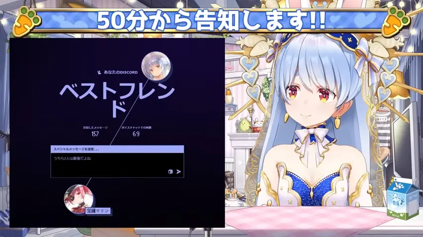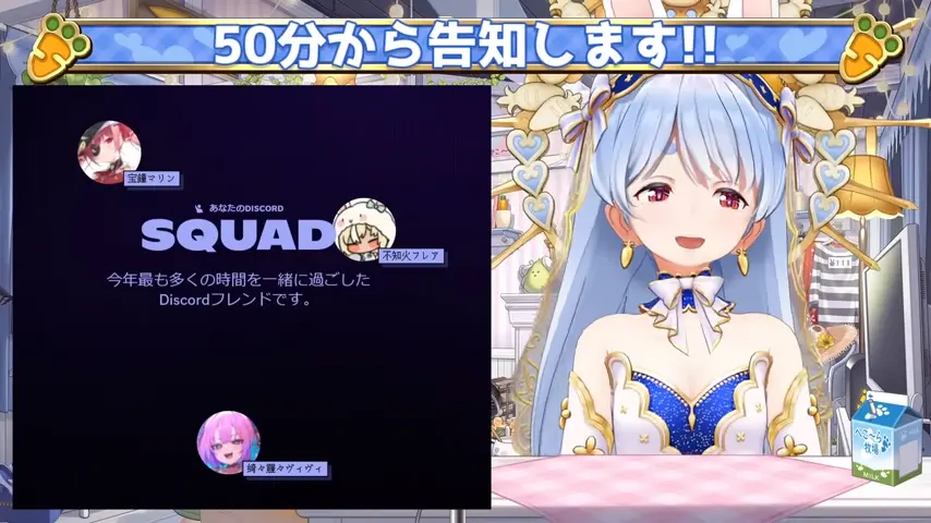 兎田ぺこらさんは配信中、Discordの「2025年のまとめ(Recap)」機能を使用し、今年最も長く通話時間を共有したフレンドを確認しました。