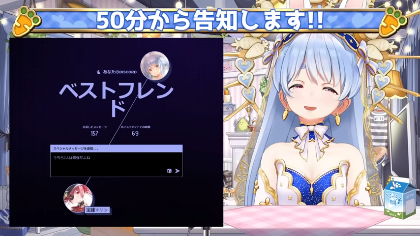 最も長い時間を過ごした第1位は、やはり同期であり盟友の「宝鐘マリン」さん。「うちら2人は最強だよね」というメッセージと共に、通話時間は69時間を記録しました。ぺこらさんはこれに対し「マリンとはLINEでもやり取りしてるから、Discordでもこんなに話してるとは意外だった」と驚きつつも、納得の表情を見せました。