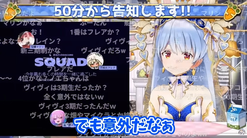 白銀ノエルさんに代わってトップ3に入ったのは、ホロライブDEV_IS「FLOW GLOW」所属の後輩、綺々羅々ヴィヴィさんでした。ぺこらさんは「ビビちゃんがここに入ってくるのがびっくりした」「コラボも多かったしね」と振り返りました。