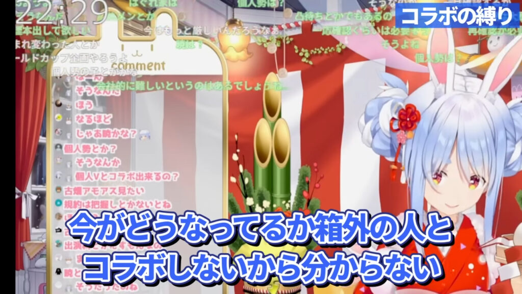 「昔は言われた箱の人、ホロメン以外の人とコラボする時は一旦マネージャーに聞いてね、みたいなのはあったけど、今がどうなってるかは正直覚えてない」