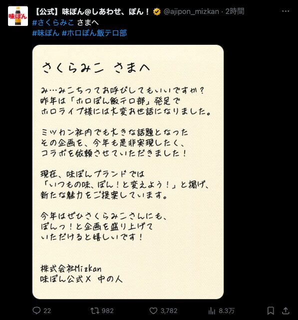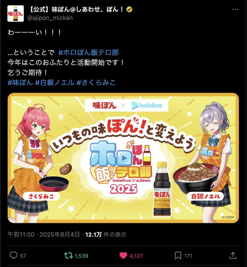 株式会社ミツカンのロングセラー商品「味ぽん」と、大人気VTuberグループ「ホロライブ」のコラボレーション企画「ホロぽん飯テロ部 2025」の始動が発表されました。