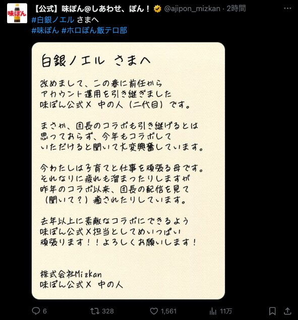 2025年の活動メンバーとして、ホロライブ所属のさくらみこさんと白銀ノエルさんの就任が決定。 「いつもの味ぽん!と変えよう」をキャッチコピーに、様々な企画が展開される予定です。