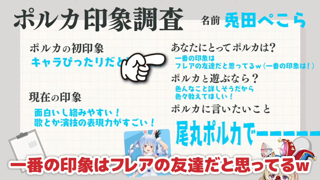 ポルカさんが行った印象調査で、ぺこらさんが提出した回答がこちら。一つずつ見ていきましょう。