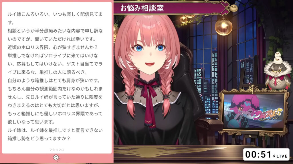 ホロライブ6期生「秘密結社holoX」の幹部・鷹嶺ルイさんが、自身の配信中にリスナーから寄せられた「ホロリス(ホロライブリスナー)界隈の空気感」に関する相談に答弁。