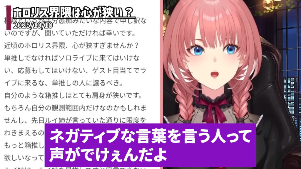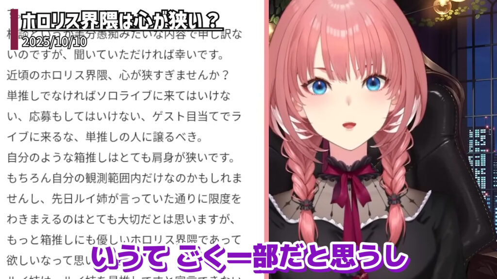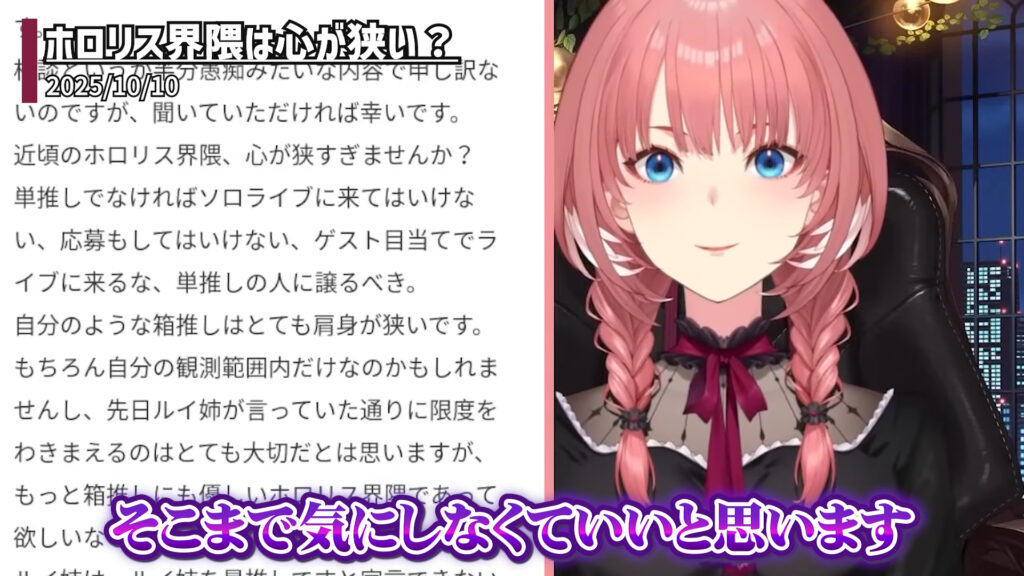 その内容は、「近頃のホロリス界隈は心が狭すぎませんか?」という問題提起から始まります。相談者によると、