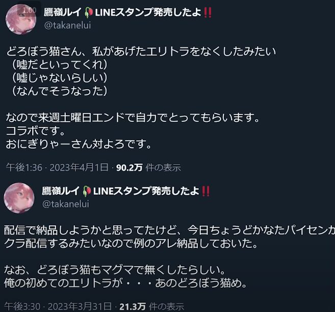 ルイは過去におかゆにゲーム内アイテムを半ば強引に奪われた「エリトラカリパク事件」を思い出し、「この流れはエリトラの時と似ている」と警戒。