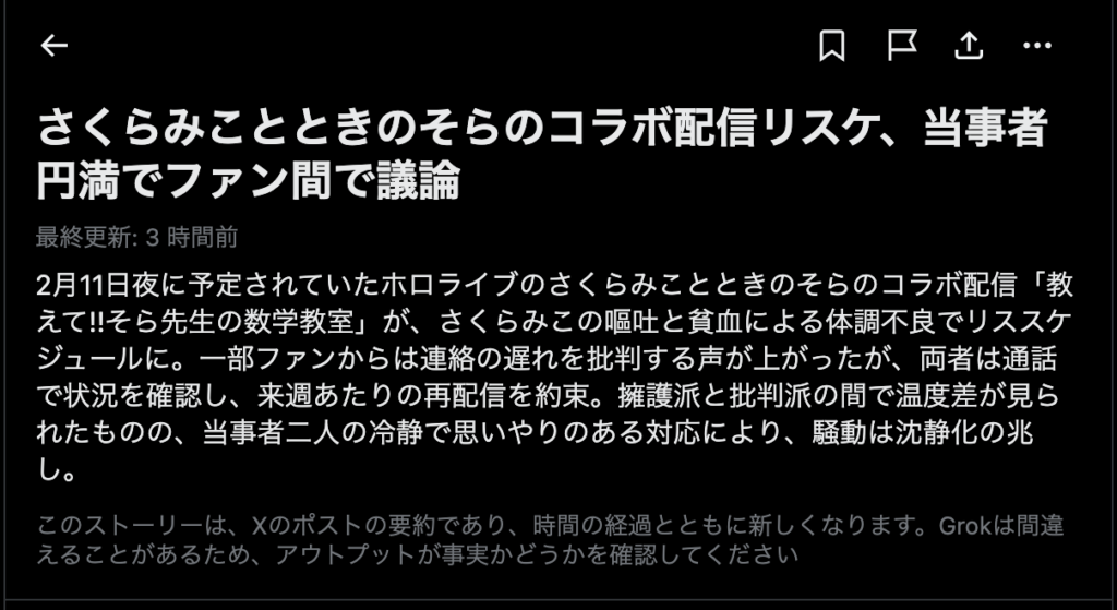 しかし体調が改善しなかったため、ときのそらさん自身がさくらみこさんの体調を気遣い、今回はリスケにしようと判断してくれたとのことでした。