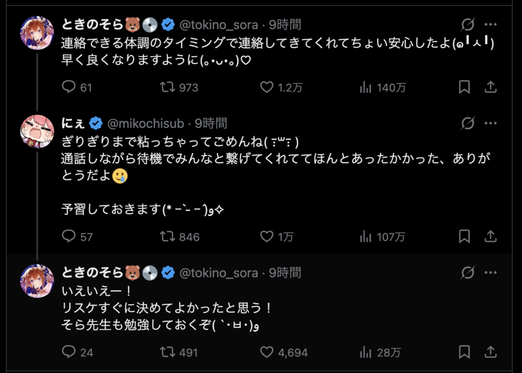 さくらみこさんのポストに対して、ときのそらさんは「連絡できる体調のタイミングで連絡してきてくれてちょい安心したよ」と返信。さくらみこさんが「ぎりぎりまで粘っちゃってごめんね」「通話しながら待機でみんなと繋げてくれててほんとあったかかった」と感謝を伝えると、「いえいえー!リスケすぐに決めてよかったと思う!そら先生も勉強しておくぞ」と明るく応じました。
