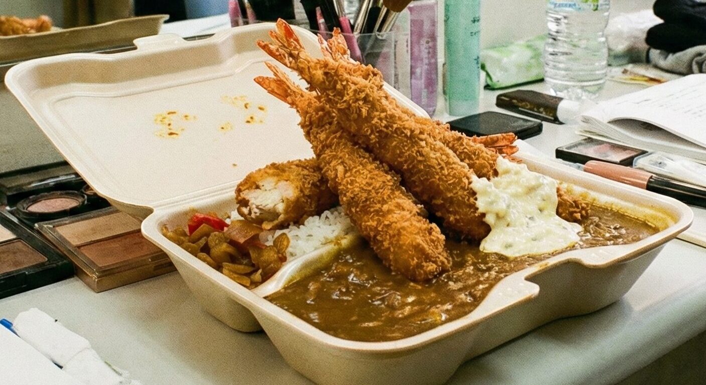 その時、楽屋にアキロゼさん本人は不在で、担当マネージャーさんだけがいらっしゃったとのこと。ふと見ると、そこには「エビフライが3本も乗った豪華なカレー」が置かれていました。