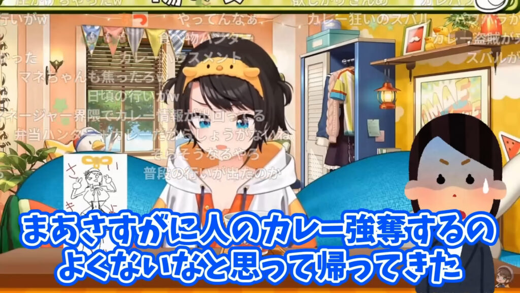 これにはスバルさんも大焦り。「違う違う! マジで違います! 全然そんなつもりじゃ!」と必死に否定。マネージャーさんの優しさと真面目さに触れつつも、結果的に「人の金で用意された食事を強奪するのは良くない」と反省し、カレーをもらわずに自らの楽屋へ戻ったとのことです。