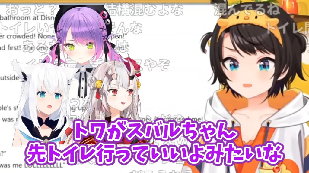 パーク内で食べ歩きを楽しんだ後、混雑したトイレへ向かった際のエピソードです。一番奥の個室しか空いておらず、常闇トワが大空スバルに順番を譲ってくれました。