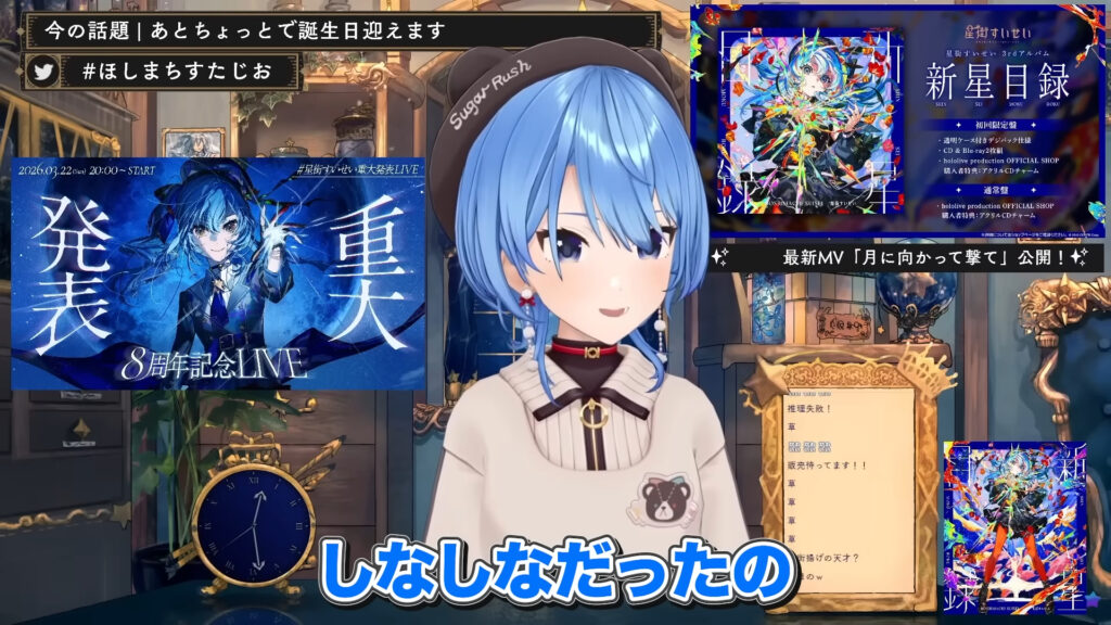 ホロライブ所属の星街すいせいが、3月21日深夜に自身のYouTubeチャンネルで生誕カウントダウン配信を実施しました。