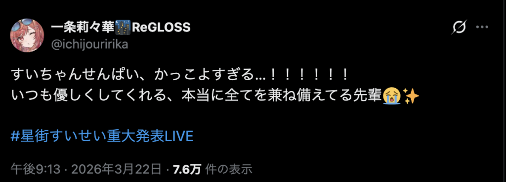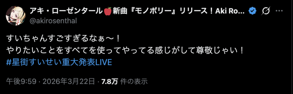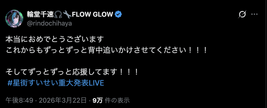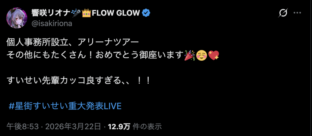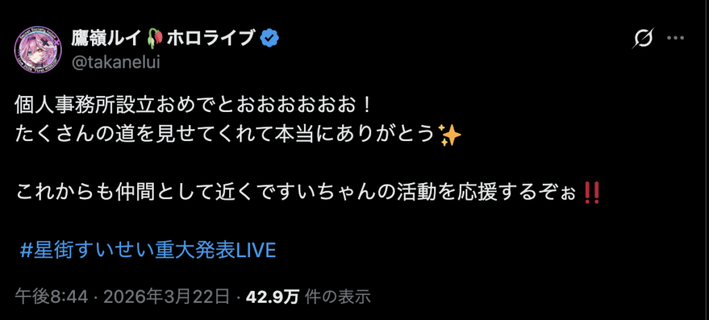 ホロライブを辞めるわけではなく、グループでの活動は続けつつ、ソロアーティストとしての音楽活動やファンクラブ運営などを新事務所で行うという、新しい両立の形となります。