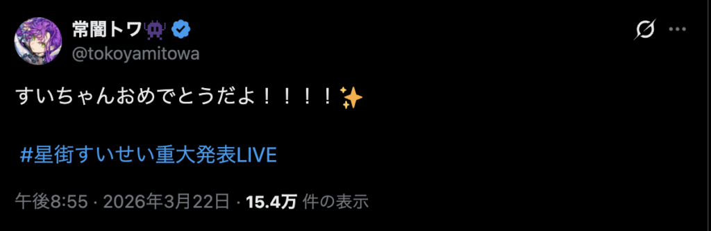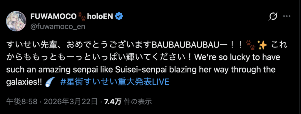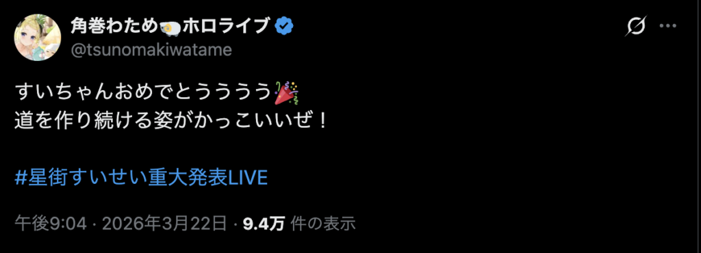 配信だけでなく、SNS上でも多くのホロライブメンバーから祝福の言葉が寄せられています。