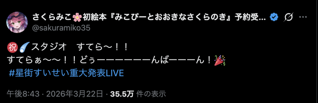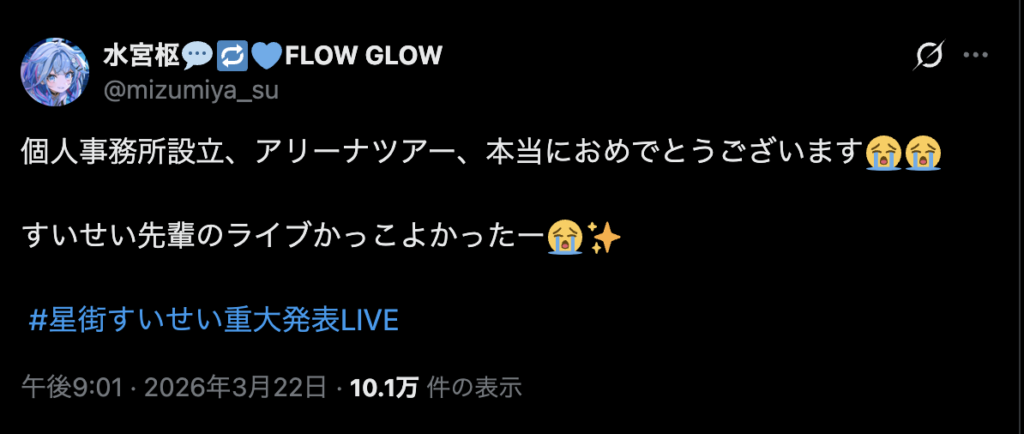 3月22日に行われた「8周年アコースティックライブ」のなかで、星街すいせいさんの個人事務所「Studio STELLAR」設立が発表されました。