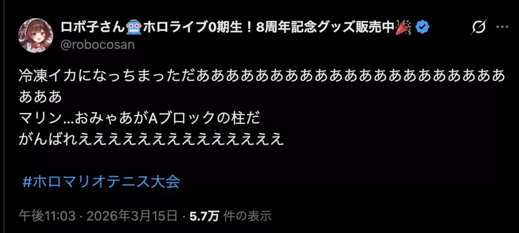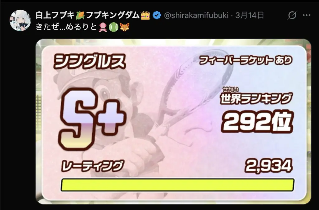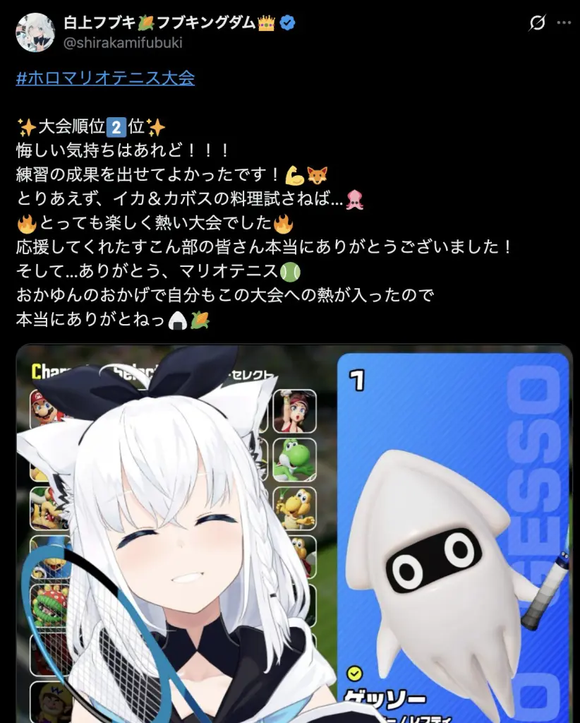 『マリオテニス フィーバー』において、猫又おかゆは世界ランク18位、白上フブキは世界ランク292位に到達したこともある実力者です。試合は白熱した展開となり、猫又おかゆは第2セットを落とすも、最終セットを7-2で制し、見事に優勝を決めました。