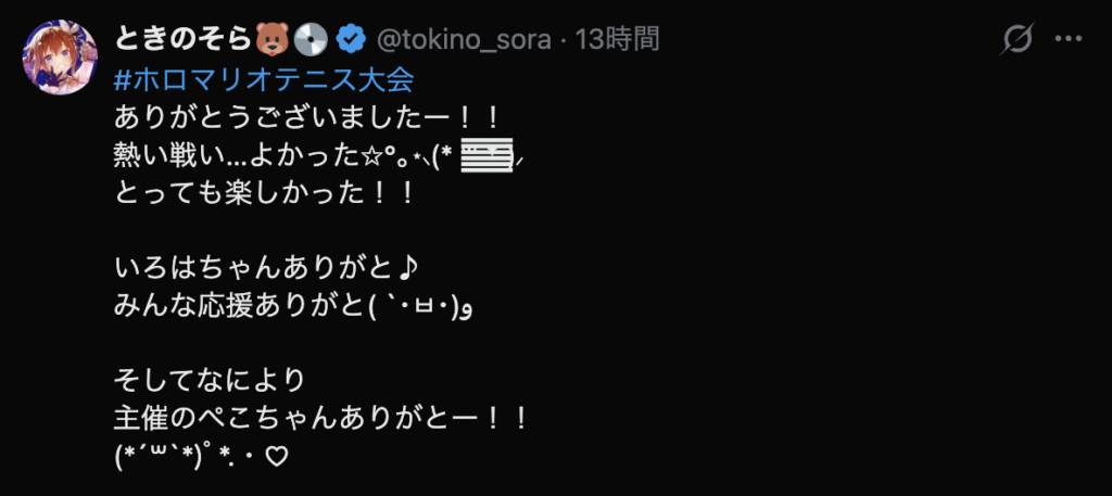 主催の兎田ぺこらは大会終了後、「熱い戦いがたくさん見れました」と参加者全員への感謝を伝えて大役を終えました。