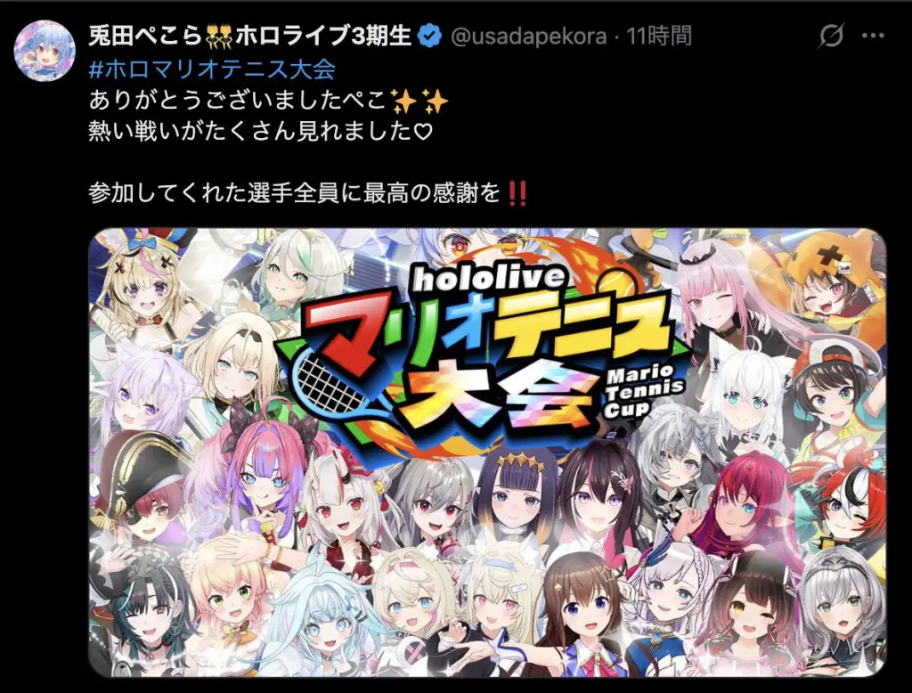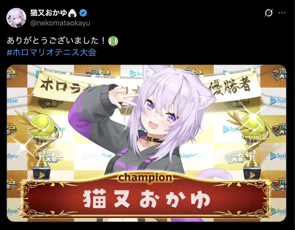 3月15日、兎田ぺこら主催のゲーム大会「ホロライブマリオテニス大会」が開かれ、猫又おかゆが優勝に輝きました。総勢26名が参加した本大会は事前の練習期間から注目を集め、本番の配信はすでに100万回以上の再生数を記録しています。