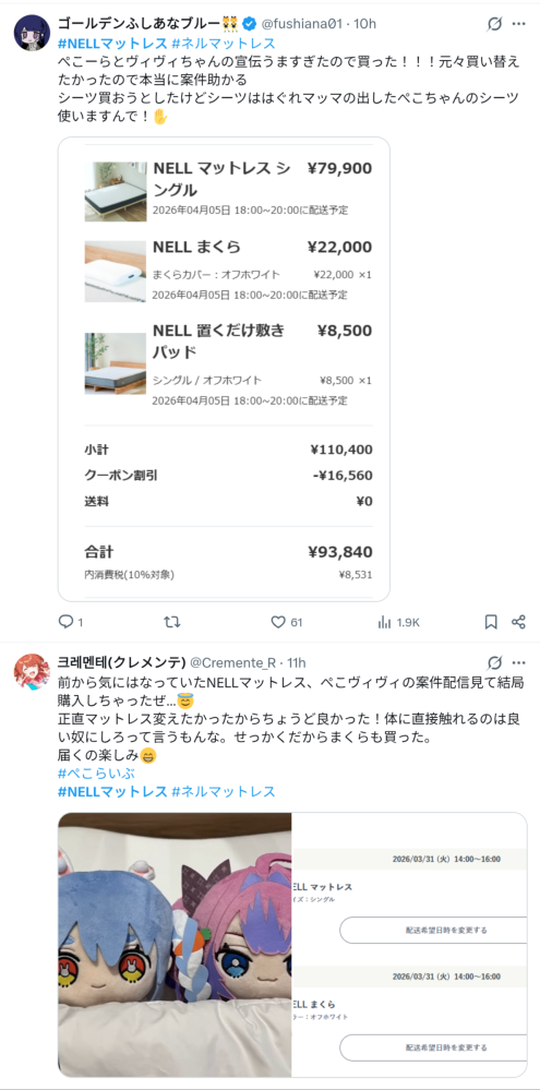 事のきっかけは、以前行われた「NELLマットレス」の案件配信。兎田ぺこらさんと綺々羅々ヴィヴィさんのコンビで紹介されたこのマットレスですが、ヴィヴィさんは配信後も継続して使用しているとのこと。