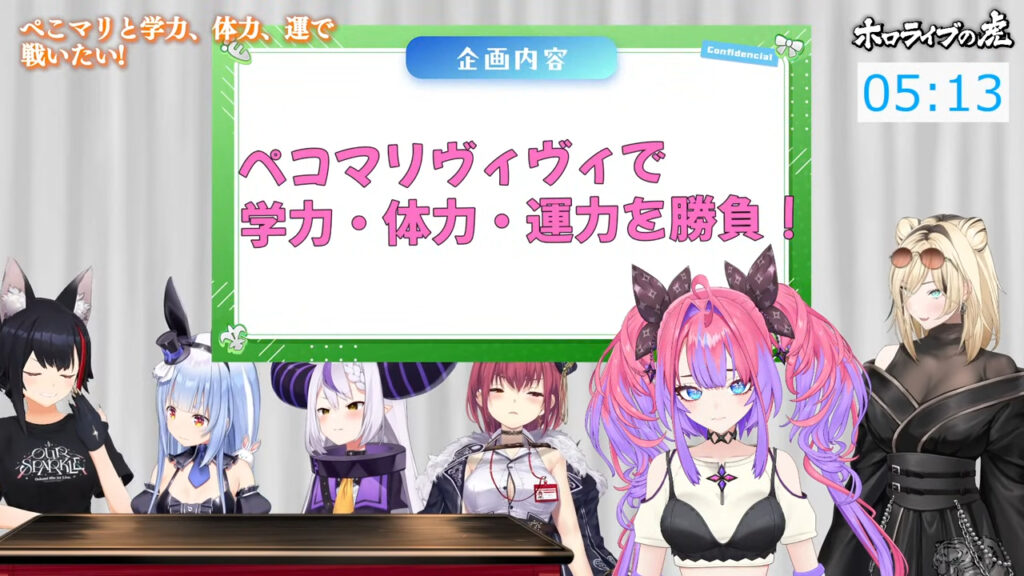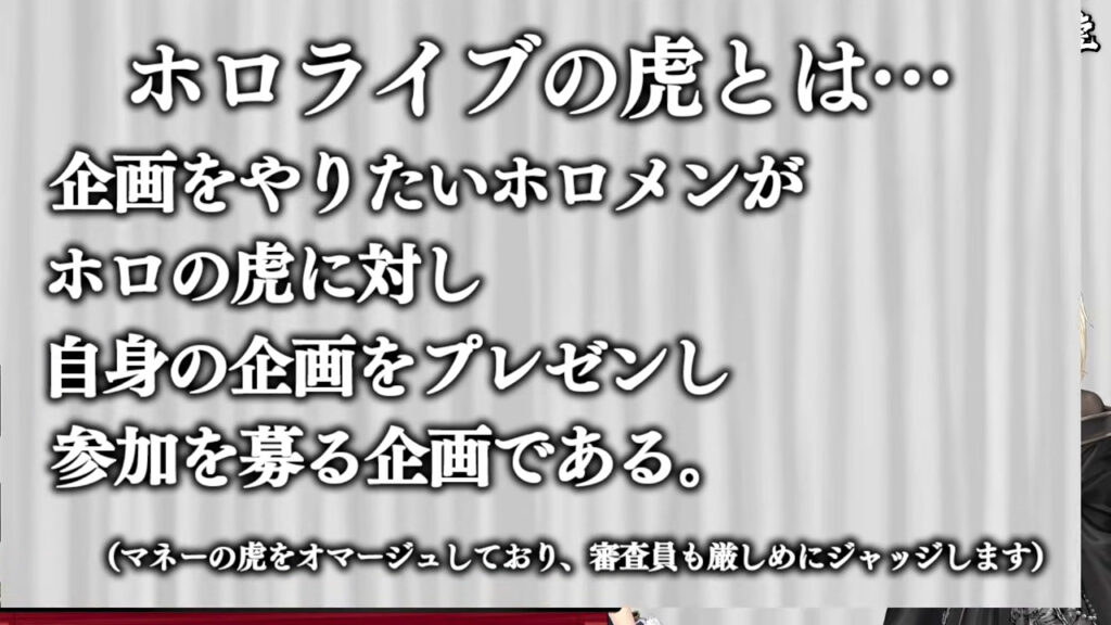 問題となったのは、2025年に開催された3期生24時間配信内の企画「ホロライブの虎」。人気番組「マネーの虎」をパロディ化したもので、後輩タレントが「やりたい企画」をプレゼンし、兎田ぺこらさんら先輩審査員が出資するかをジャッジする内容でした。