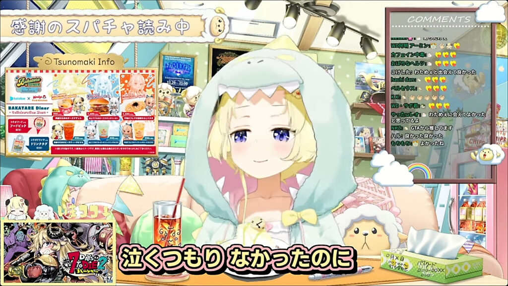 配信終盤、角巻さんはファンから寄せられた「7DaysでのWatameだけの唯一無二が生まれたんだなって、なんだかすごい嬉しくなっちゃった」「めっちゃ楽しませてもらったよ。参加してくれてありがとう」といった温かいスーパーチャットを読み上げると、次第に言葉を詰まらせ、ついに「うるとしちゃった」と涙。
